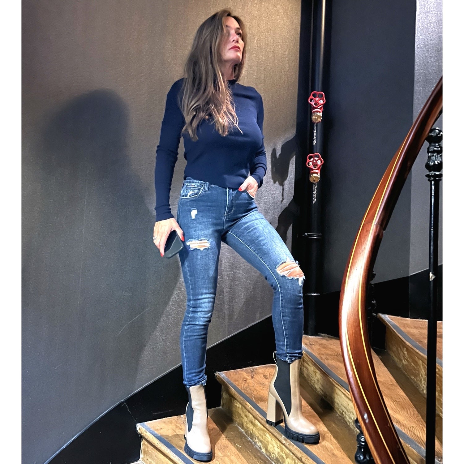 - Zu lange und zu weite Hosen: Trägst du sehr lange und weite Hosen, sind deine Boots praktisch nicht sichtbar. Zudem staucht dieser Look optisch das Bein.
